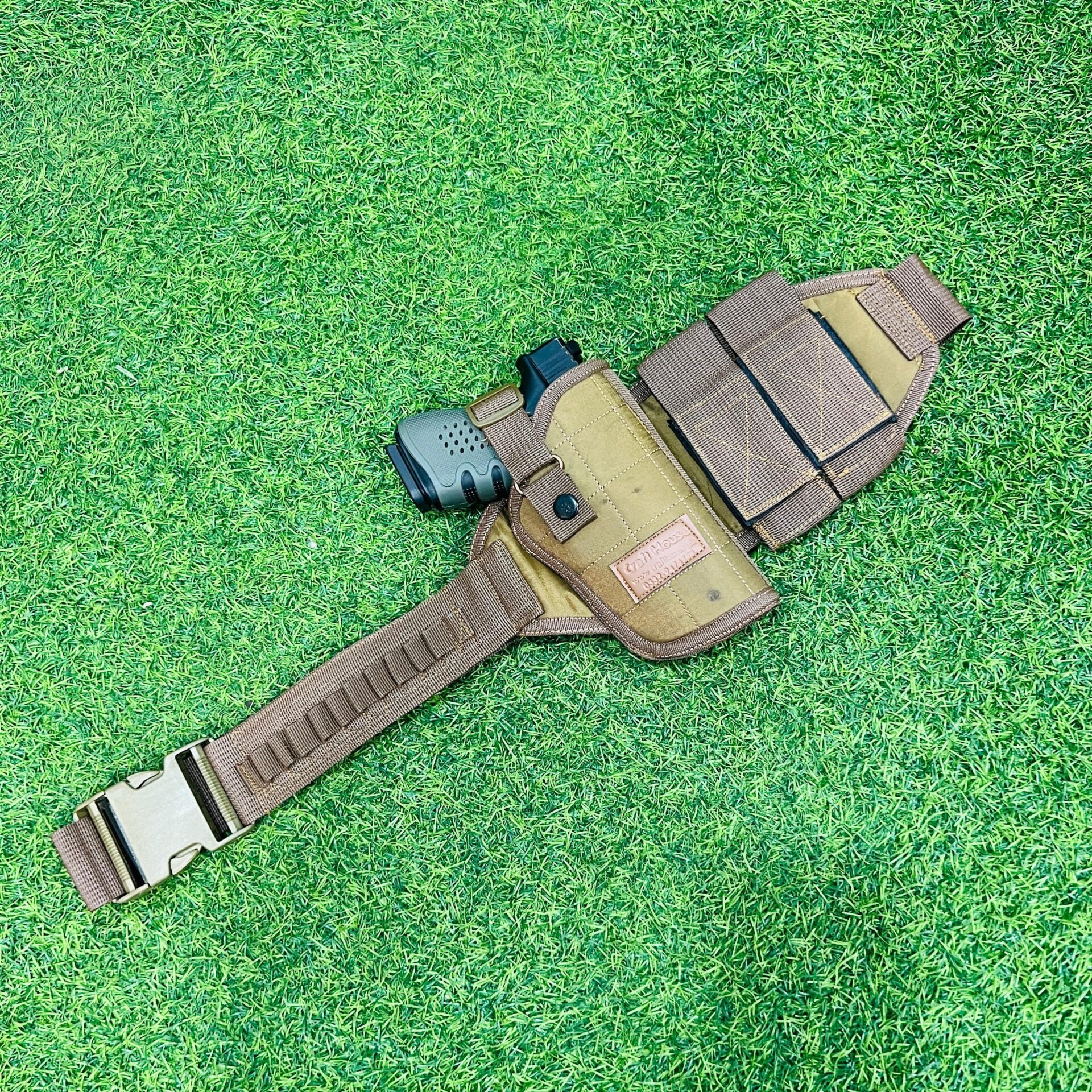 This adjustable golden belt holster is designed for 9mm pistols, offering a secure and customizable fit. It includes two spare magazine pouches, allowing quick access to extra ammunition. Crafted for durability and ease of use, this holster ensures reliable carry and efficient reloads, making it an essential accessory for professionals seeking both functionality and style.